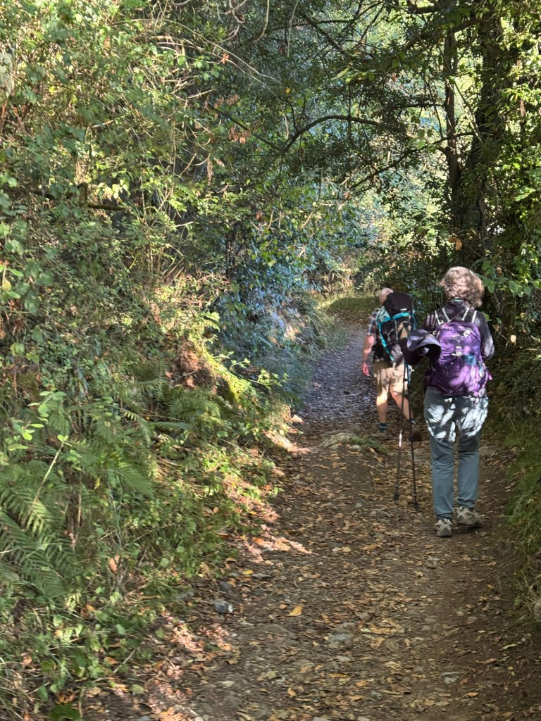 I set out on the trail hearing the familiar gravel trail crunching softly under my feet, each step steady and grounding. The air carried a delicate scent of eucalyptus, faint but soothing, mixing with the warmth of the sun beneath the blue sky. Slowly, the chatter in my mind began to fade. There was only the rhythm of my breath, the sway of my pack, and the quiet company of a few pilgrims sharing this path..including Kathleen. Out here, surrounded by nature’s simplicity, I feel less like I’m chasing something new and more like I’m returning to myself.
